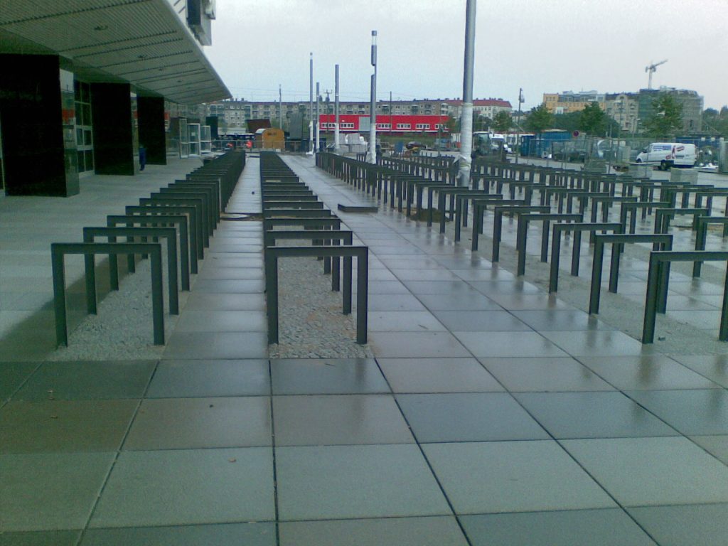 Unser heutiges Bild zeigt einen Blick auf die Hunderten von brandneuen Fahrradabstellbügeln, die, eingebettet in uralten Naturstein und kleinteilige Pflasterung, die noch nicht zugängliche Baustelle der O2-Arena in Friedrichshain-Kreuzberg zieren.